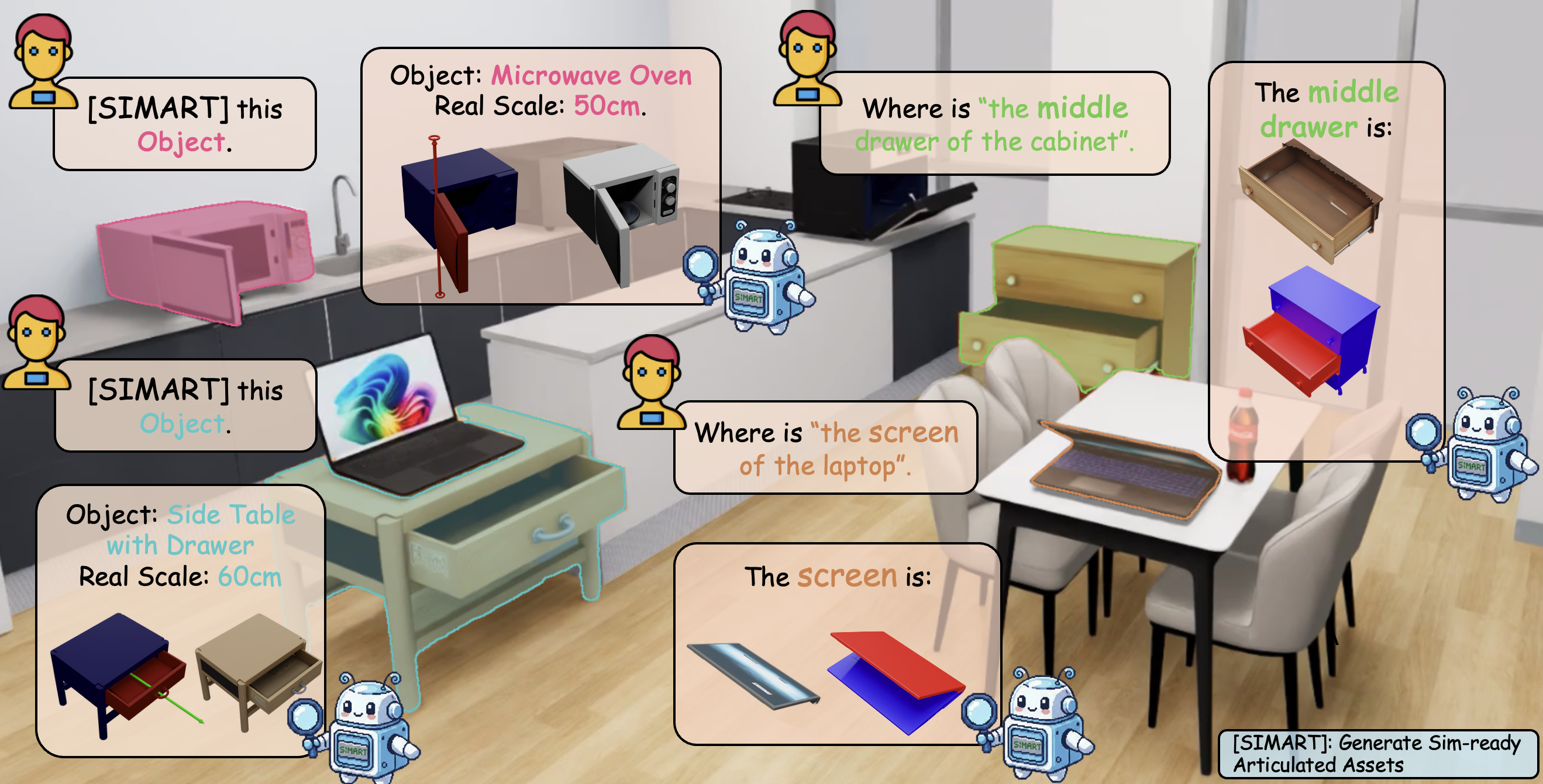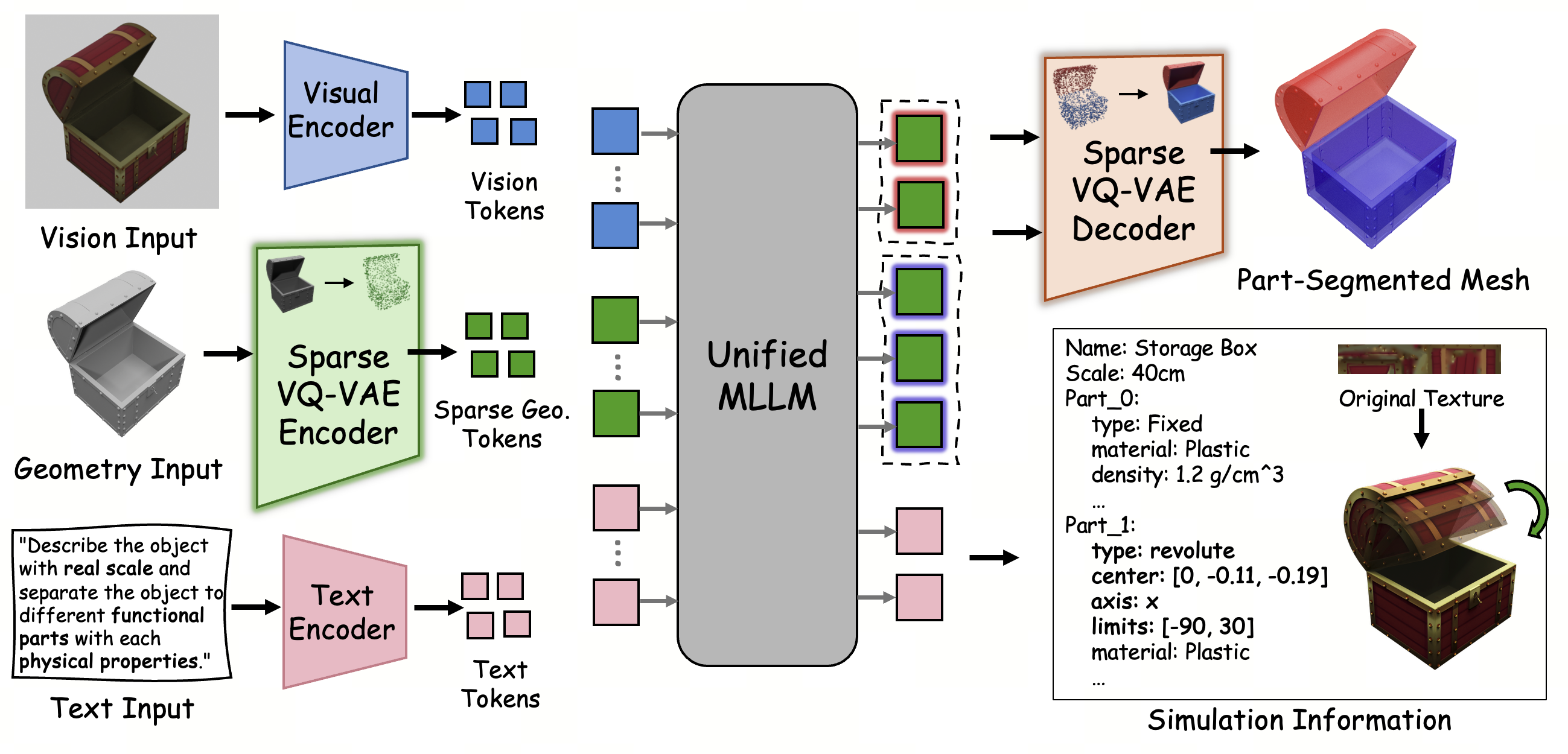 SIMART irst encodes 3D geometry into a compact representation using the Sparse 3D VQ-VAE to minimize token redundancy while preserving critical surface details. These geometric tokens are then fused with visual and textual inputs through a unified MLLM backbone to perform part grounding and joint parameter estimation. The final output consists of structured URDF metadata and decomposed segments, enabling deployment into physics-based simulators and interactive robotic environments.