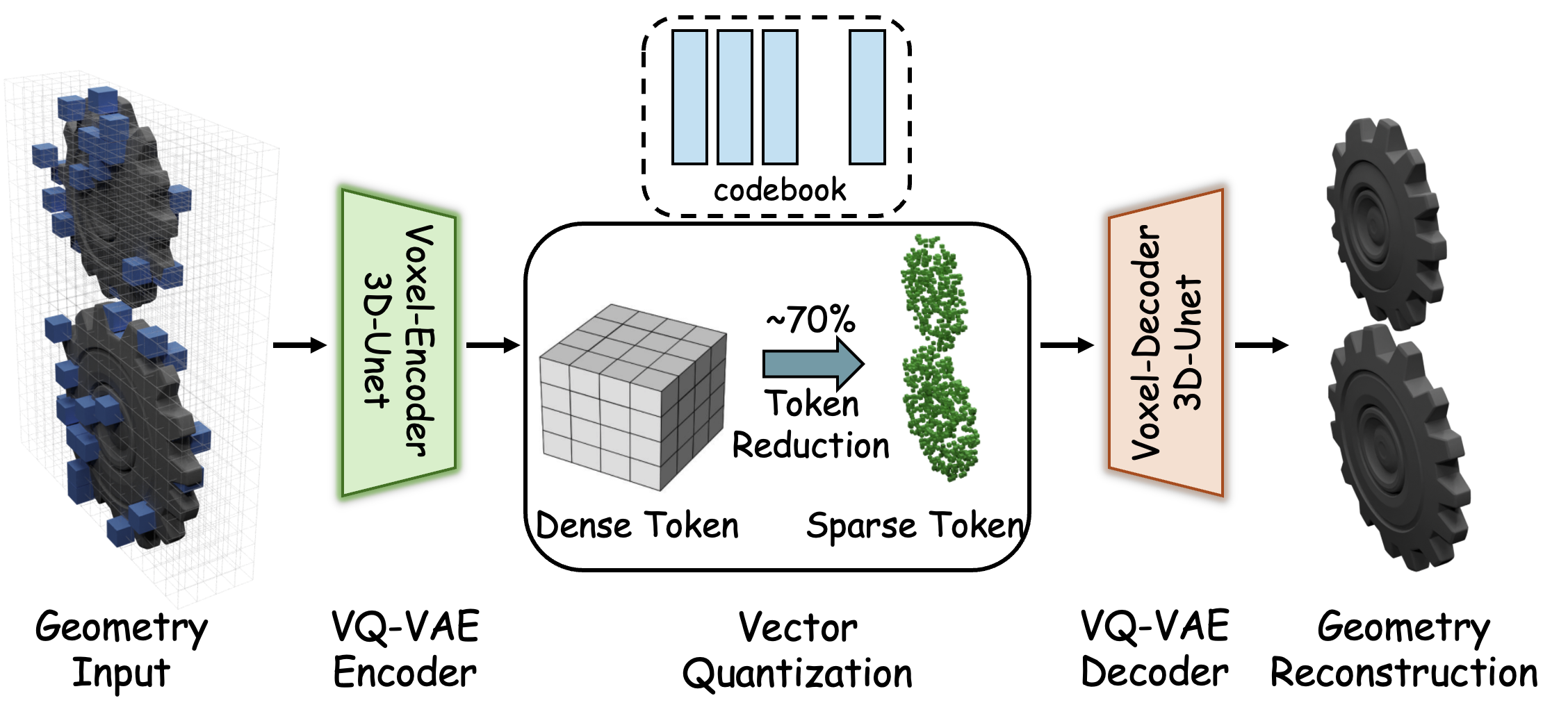 Architectural overview of the Sparse 3D VQ-VAE for high-fidelity geometric encoding. The pipeline employs a 3D-UNet voxel encoder to map geometric inputs into a discrete latent space through vector quantization with a specialized codebook.